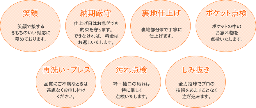 お客様にとって服や靴、帽子は、たくさん思い出が詰まった大切な品のため、少しでもお客様の品を末永くご使用になりたいとのご期待に応えられるようなクリーニング店で在り続けたいと思い、日々精進してまいります。